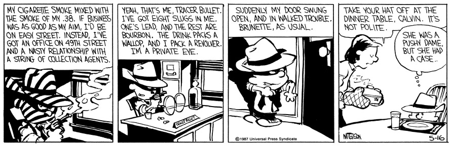 Tracer Bullet never quite took hold in Watterson’s repertoire in the way Spaceman Spiff or even Stupendous Man did. That’s probably because hard-boiled noir is a tough genre to pull off, even as a spoof, when your protagonist is six years old. Calvin and Hobbes is generally about the way the world might appear broken to an imaginative kid, whereas noir is about the way the brokenness of the world manifests in the most adult, tawdry, vice-laden ways.